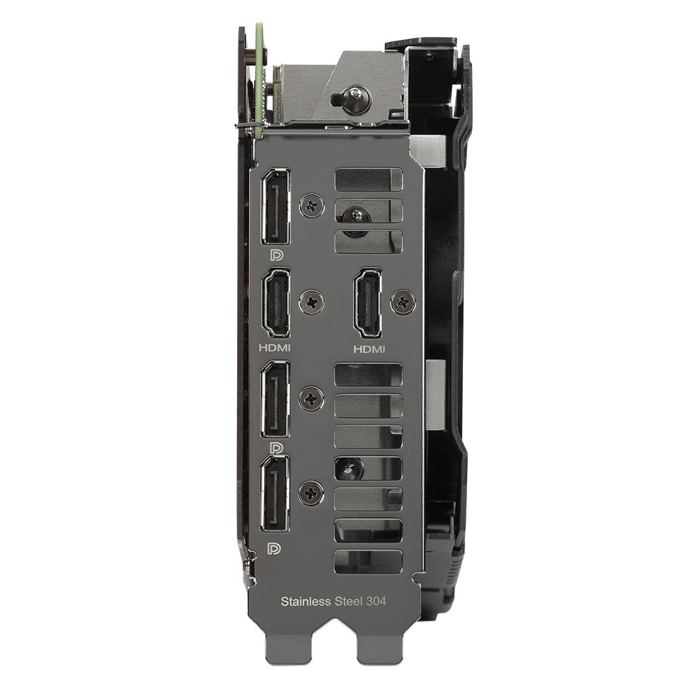Phần lớn phía sau được bọc trong một tấm lưng kim loại bảo vệ nổi bật với một lỗ thoát khí lớn. Thép không gỉ trên card đồ hoạ TUF RTX 3060 Ti được sử dụng cho khung I/O để bảo vệ các cổng và giúp giá đỡ an toàn hơn. Công tắc Dual Bios được đặt thuận tiện cho phép tùy chỉnh cấu hình hiệu năng mặc định của card mà không cần qua phần mềm.