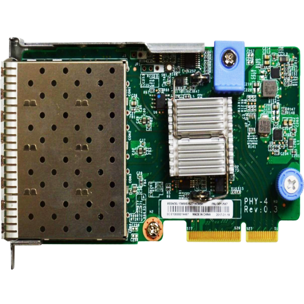 Máy chủ ThinkSystem hỗ trợ kết nối đồng hoặc quang 10 Gb Ethernet hoặc kết nối Gigabit Ethernet tùy thuộc vào kiểu máy chủ. Hình dưới đây cho thấy bộ điều hợp ThinkSystem 10Gb 4 cổng SFP + LOM cung cấp bốn lồng SFP + cho kết nối đồng (DAC) quang hoặc gắn trực tiếp.